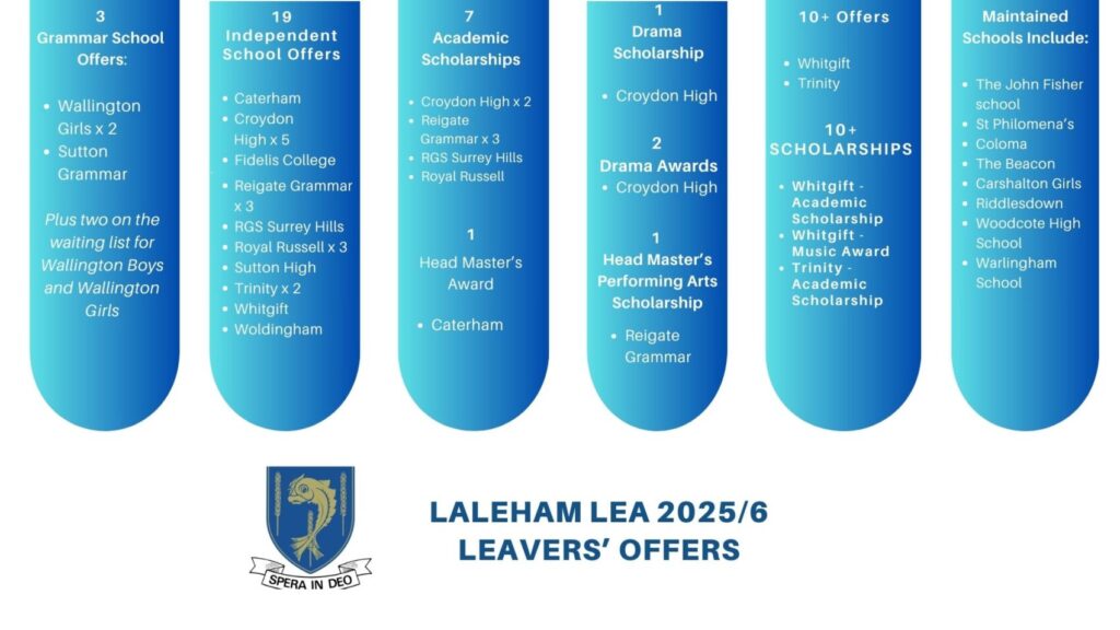 | Leavers’ Offers 2021 | 6 Grammar, 7 Grammar Stream Offers 24 Independent School Offers 9 Academic Scholarships (Whitgift, Reigate Grammar, Old Palace x2, Croydon High, Cedars, Sutton High, St Theresa’s, Caterham) 3 Music Scholarships (Caterham, Old Palace, Reigate Grammar) 1 Head Master’s Award (Reigate Grammar) 1 Sports Scholarship (Reigate Grammar) 100% First Choice Catholic Schools 100% First Choice Maintained Schools |